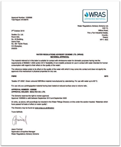 ST-2052無(wú)石棉板獲得英國飲用水WRAS的認證證書(shū)