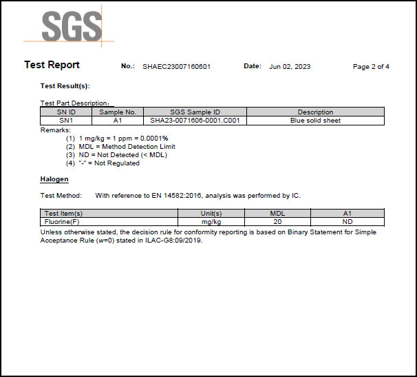 為滿(mǎn)足客戶(hù)需求,近日SealTex索 ST-2058無(wú)石棉板通過(guò)了SGS進(jìn)行的鹵素(氟)檢測,檢測標準EN 14582-2016,報告顯示未測出氟,報告部分截圖如下: